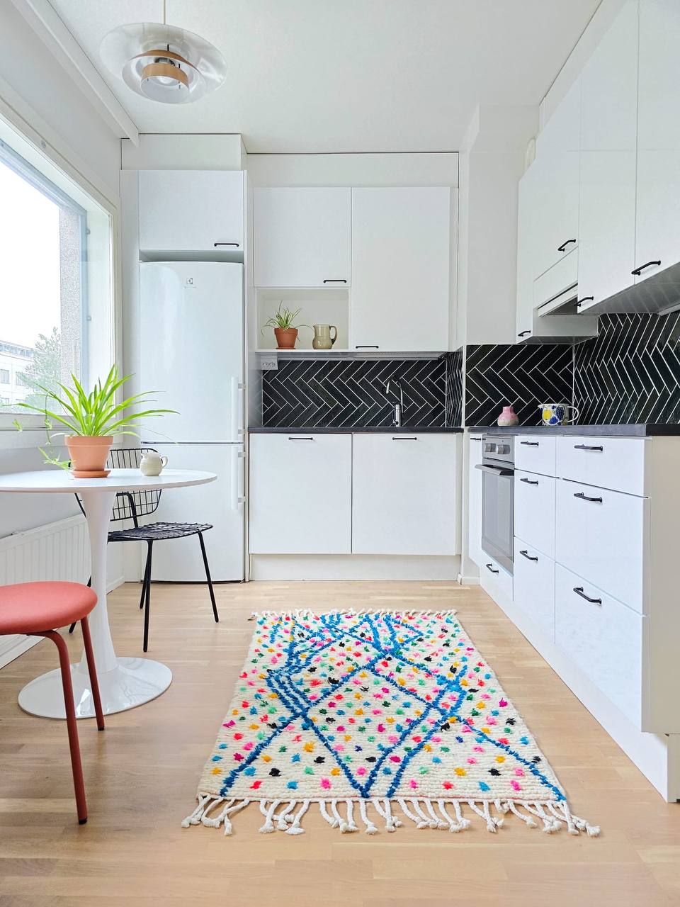 Interestingly, Azilal rugs were unknown to the worl until recently - they have been in the market not longer than couple decades! Azilal rugs are made from sheep wool, sometimes mixed with cotton. The Azilal rugs are becoming more popular as a more colourful vintage alternative to the most famously known Beni Ourain rugs. The Azilal region is in High Atlas Mountains. They have lot of culture, creativity and uniqueness in each one of them. No wonder they are so beloved.