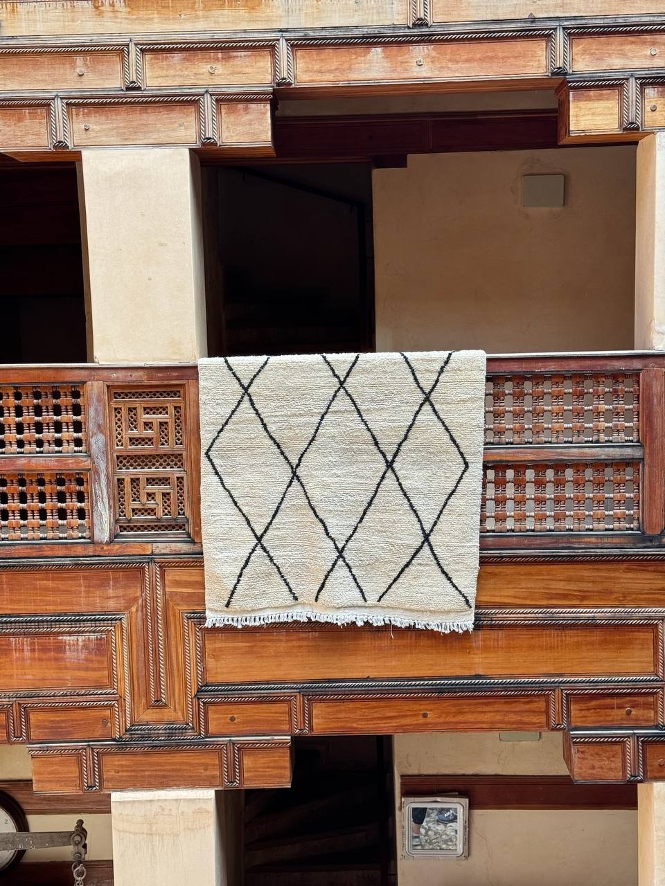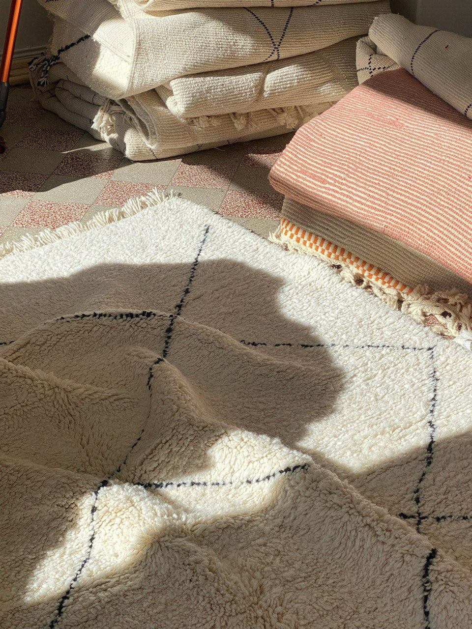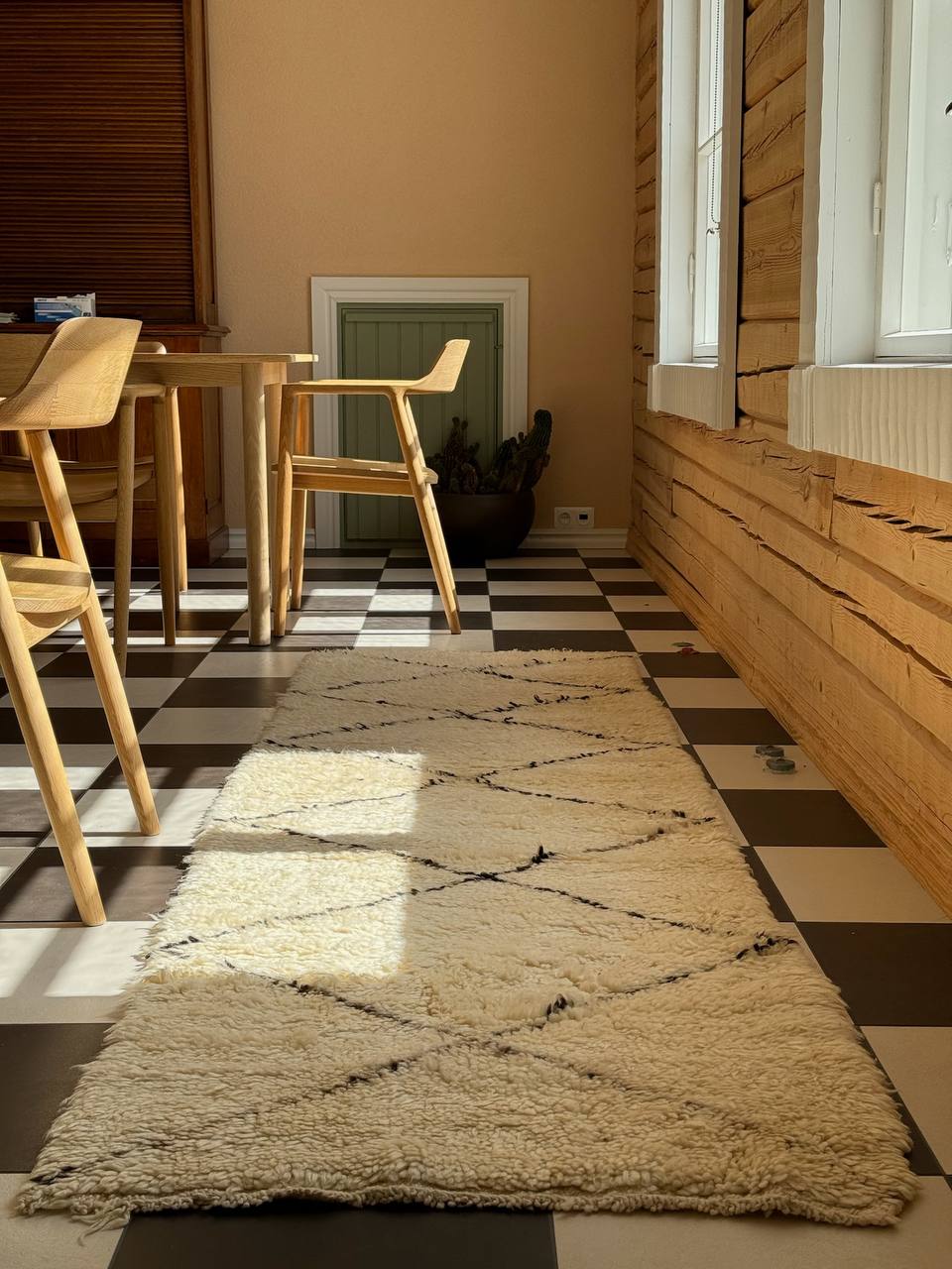 A true timeless classic. Moroccan berber rug in white base colour and black diamond details. Natural, renewable sheep wool. Made by berber women in Moroccan Atlas Mountains.