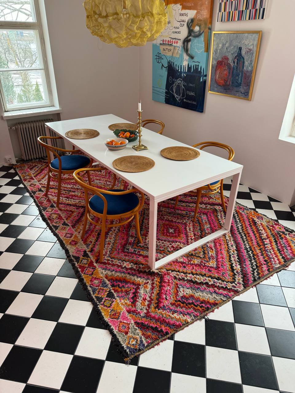 Iso Zayane matto valtasi huoneen värillään ja akustiikan muutoksella. Ihanan pehmeä ja lämmin. Kasvisvärin punainen sävykäs. Toivon että joskus näihin vintage mattoihin saataisiin QR koodi josta löytyy materiaalia kutojasta sekä heimon elämästä. Matolla on tarina ja myös henki.